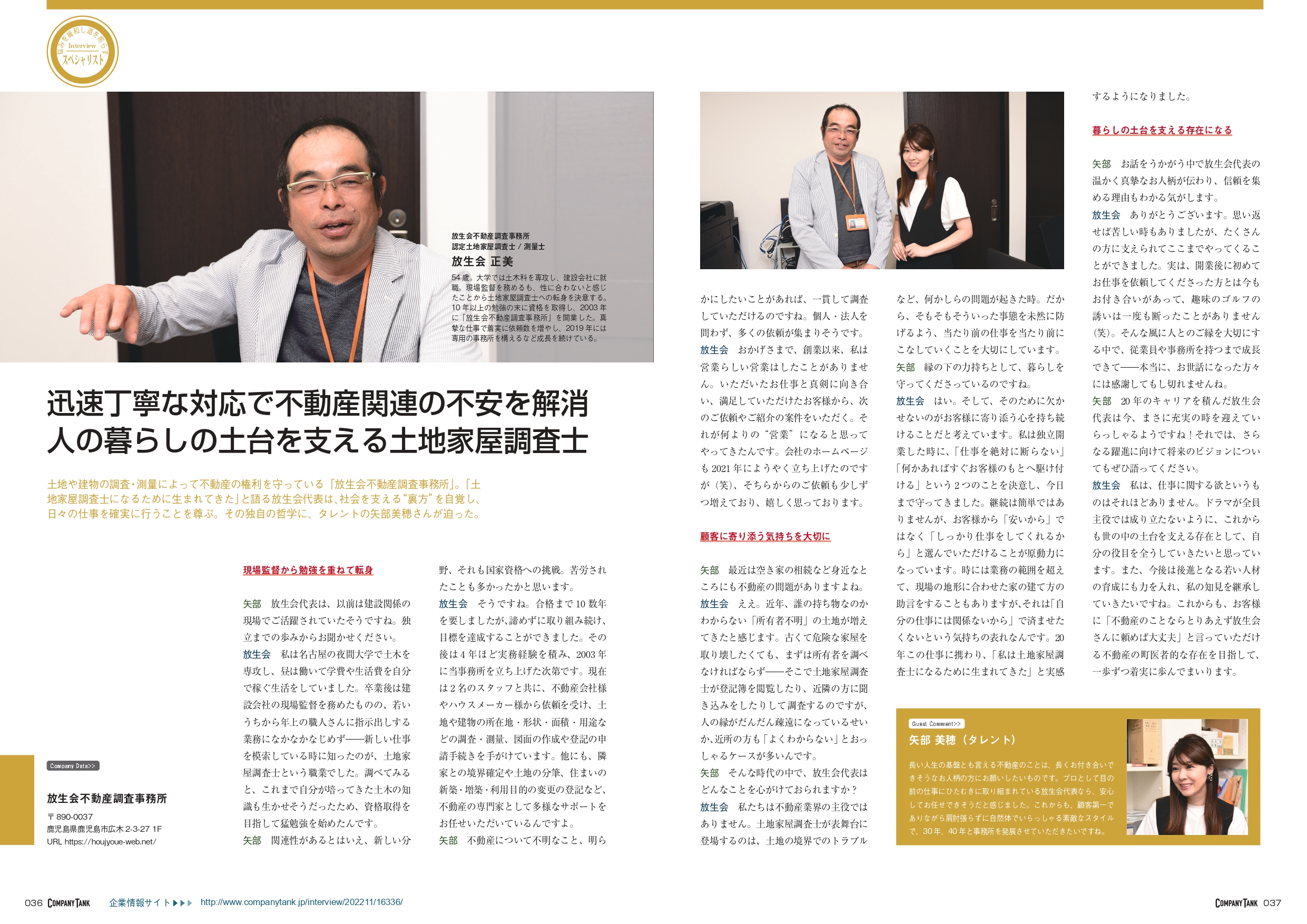 みなさまの重要な財産である土地や建物は、法務局(登記所)にある登記簿に記録することにより、その権利が保全されます。わたしたち放生会不動産調査事務所は、所有者の依頼によって土地や建物の所在や形状、またその用途について調査、測量して図面作成、申請手続などを行う測量及び法律の専門家として鹿児島県鹿児島市で活躍しております。